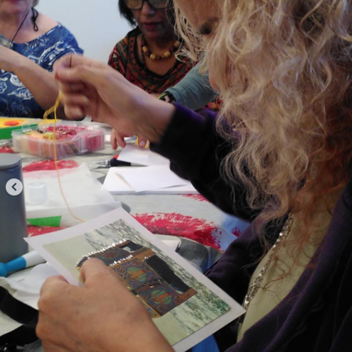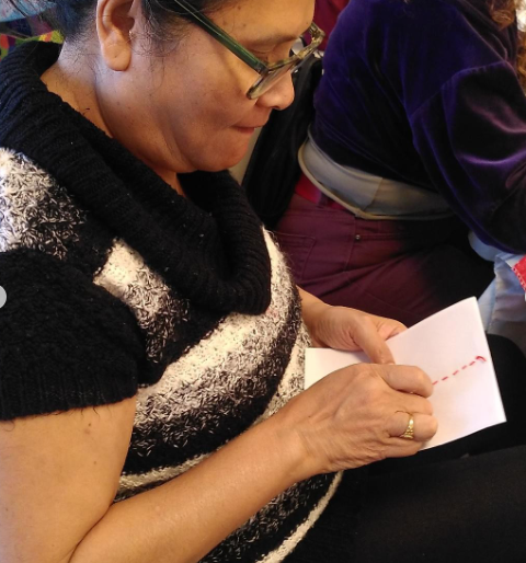 Atelier 𝘽𝙧𝙤𝙙𝙚𝙧𝙞𝙚 𝙨𝙪𝙧 𝙘𝙖𝙧𝙩𝙚 𝙥𝙤𝙨𝙩𝙖𝙡𝙚 - 𝗘𝘀𝗽𝗮𝗰𝗲 𝗗𝗲́𝗰𝗼𝘂𝘃𝗲𝗿𝘁 du Carrefour d'aide aux nouveaux arrivants. Montréal, février 2024. Photo:Carrefour d'aide aux nouveaux arrivants (CANA)