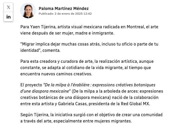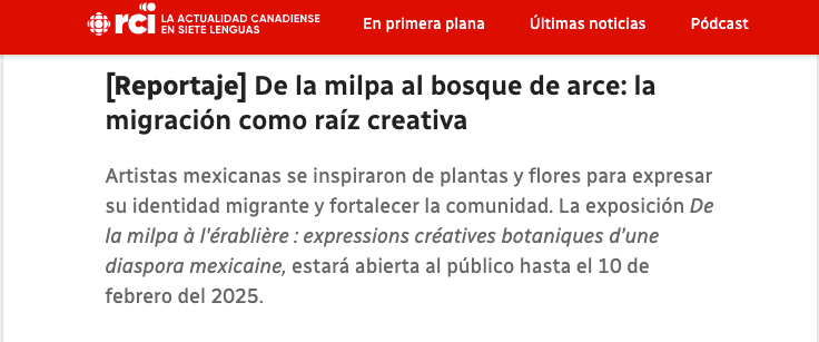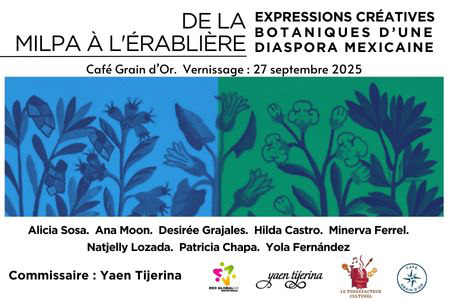 « De la milpa à l'érablière : expressions créatives botaniques d’une diaspora mexicaine » est une exposition plastique née d’un projet de médiation culturelle que j’ai eu le plaisir de co-diriger au sein de la communauté mexicaine de Montréal, en collaboration avec Gabriela Casas, directrice de la Red Global MX - Chapitre Montréal, avec l'appui du CRIC Ce projet avait pour objectif d'inviter les artistes mexicains, amateurs et professionnels, à participer et à engager un dialogue créatif avec leur environnement, tout en favorisant la création d'une communauté artistique. Le projet vise également à explorer la complexité de l’implantation dans un nouveau contexte culturel en s'inspirant des métaphores végétales.
